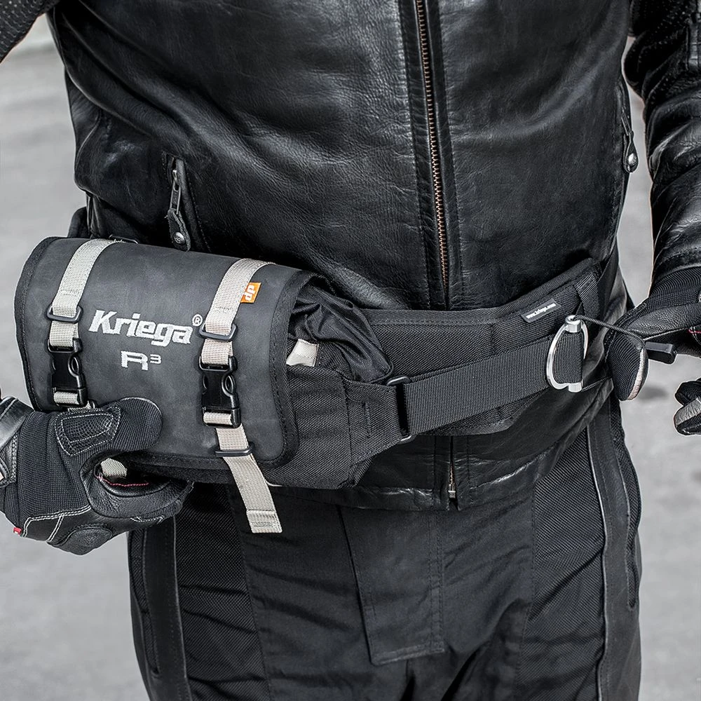 The R3 is the most practical waist-pack for all journeys, adjusting quickly and easily to gain access to your money, camera, sunglasses etc. Kriega’s signature alloy belt adjuster sets the waist tension in seconds and eradicates loose strap ends giving an uncluttered design. Once the belt tension has been released the pack can be easily be moved around to gain access to items, without the need to take off and on each time. A 100% waterproof main compartment with a roll-top closure guarantees your kit stays dry and the seam sealed white liner can be easily removed for cleaning. A zipped mesh pocket in the flap is ideal storage for tickets, passport etc. Whereas the front zipped pocket provides quick access storage for a disc lock, keys etc. The tough Hypalon construction make this one of the world’s most practical and hard-wearing packs for sport, trail and street.