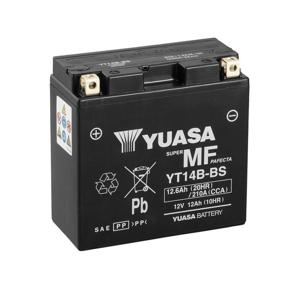 De Yuasa YT14B-BS motoraccu heeft een spanning van 12V, een capaciteit(10H) van 12 Ah en een startcapaciteit van 210 A (CCA). De afmetingen zijn 150 mm lang, bij 70 mm breed, bij 145 mm hoog.Â